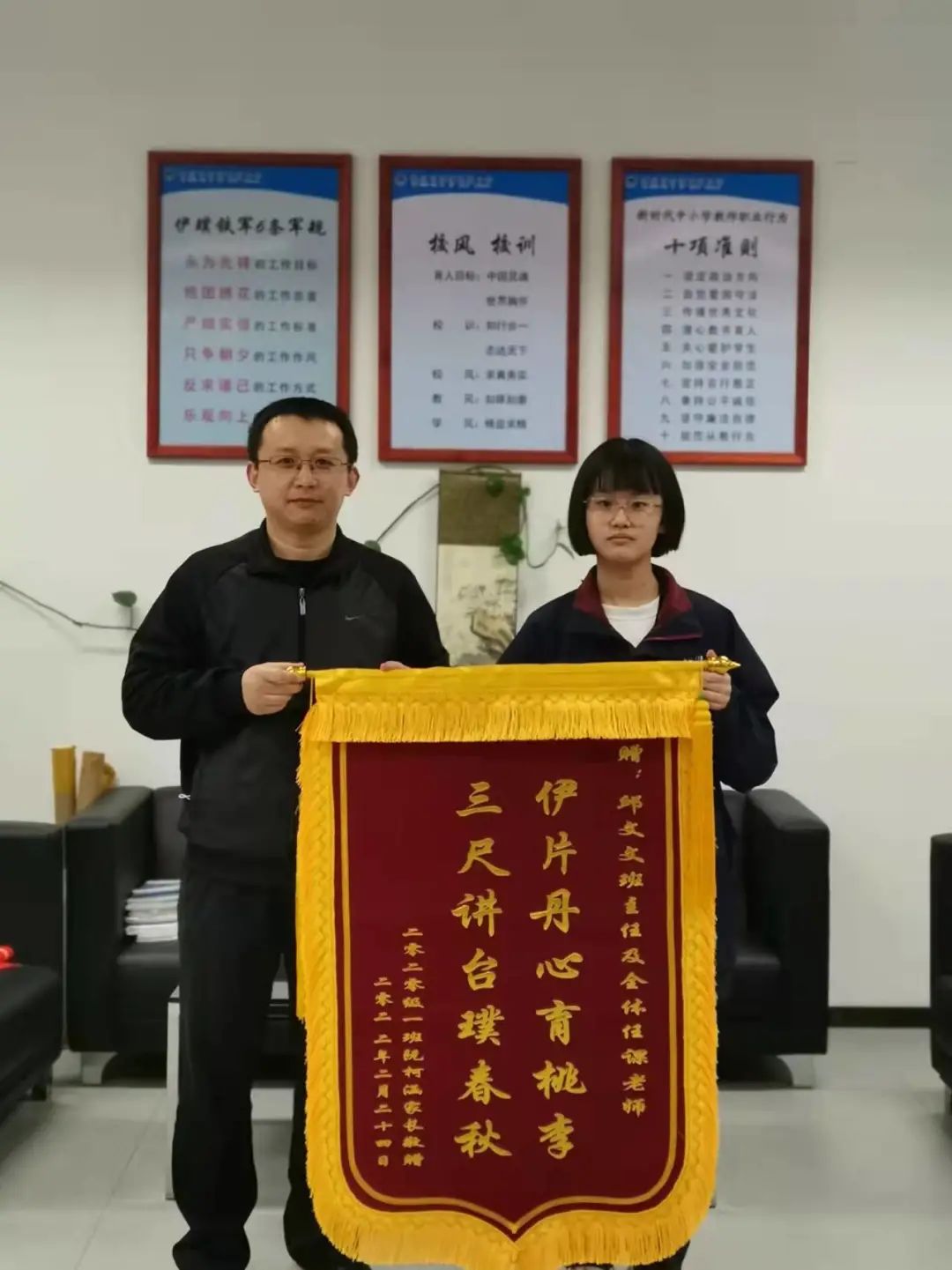 一根粉筆,書寫過多少春夏秋冬;三尺講臺,經歷過多少人來人往。不計辛勤一硯寒,桃熟流丹,李熟枝繁,種花容易樹人難。濃濃情意在春日暖陽中悄然而至,2月24日下午,我校高二1班阮柯涵的家長把一面寫有“伊片丹心育桃李,三尺講臺璞春秋”的錦旗送到班主任邱文文老師手中,以此感謝班主任及全體任課老師對孩子的潛心教育和無微不至的關懷。