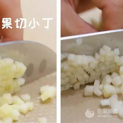 3、蘋果、梨去皮,切小丁。在準備水果的時候,最好動作快一點,因為水果氧化變黑得非常快。