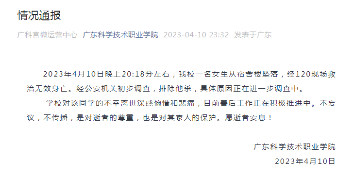 導讀來源廣東科學技術職業學院 2023年4月10日晚上20:18分左右,我校一名女生從宿舍樓墜落,經120現場救治無效身亡。經公安機關初步調查,排除他殺,具體原因正在進一步調查中。 學校對該同學的不幸離