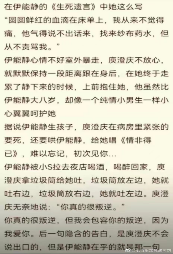 伊能靜甚至表示太愛庾澄慶了,以至于像舊社會的女孩子一樣想用孩子來鞏固自己的地位。