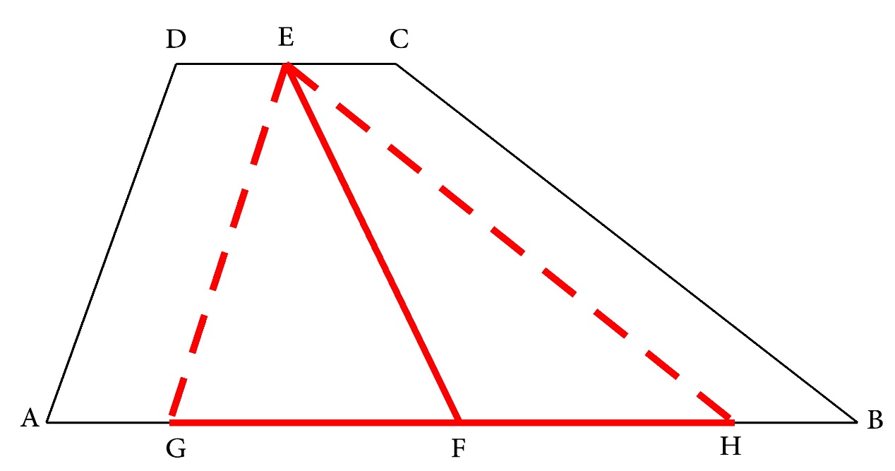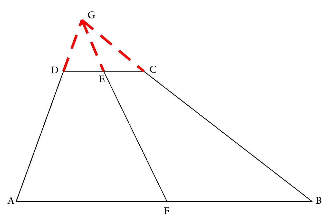 若考慮過E點作腰的平行線,則過E分別作CB、DA的平行線交AB于H、G(如圖3-192),即可得∠A=∠EGH,∠B=∠EHG,所以∠A+∠B=∠EGH+∠EHG=90°,也就可得∠GEH=90°。而由DC∥AB,又可得四邊形AGED和BHEC都是平行四邊形,AG=DE、BH=EC。由于條件中還給出F、E分別是AB、DC的中點,所以GF=AF-AG=BF-DE=BF-EC=BF-BH=FH,這樣又出現了F是Rt△GHE的斜邊的中點,所以可應用直角三角形斜邊上的中線這個基本圖形的性質進行證明,也就可得EF=1/2GH。而GH=AB-(AG+BH)=AB-(DE+EC)=AB-CD,所以分析可以完成。