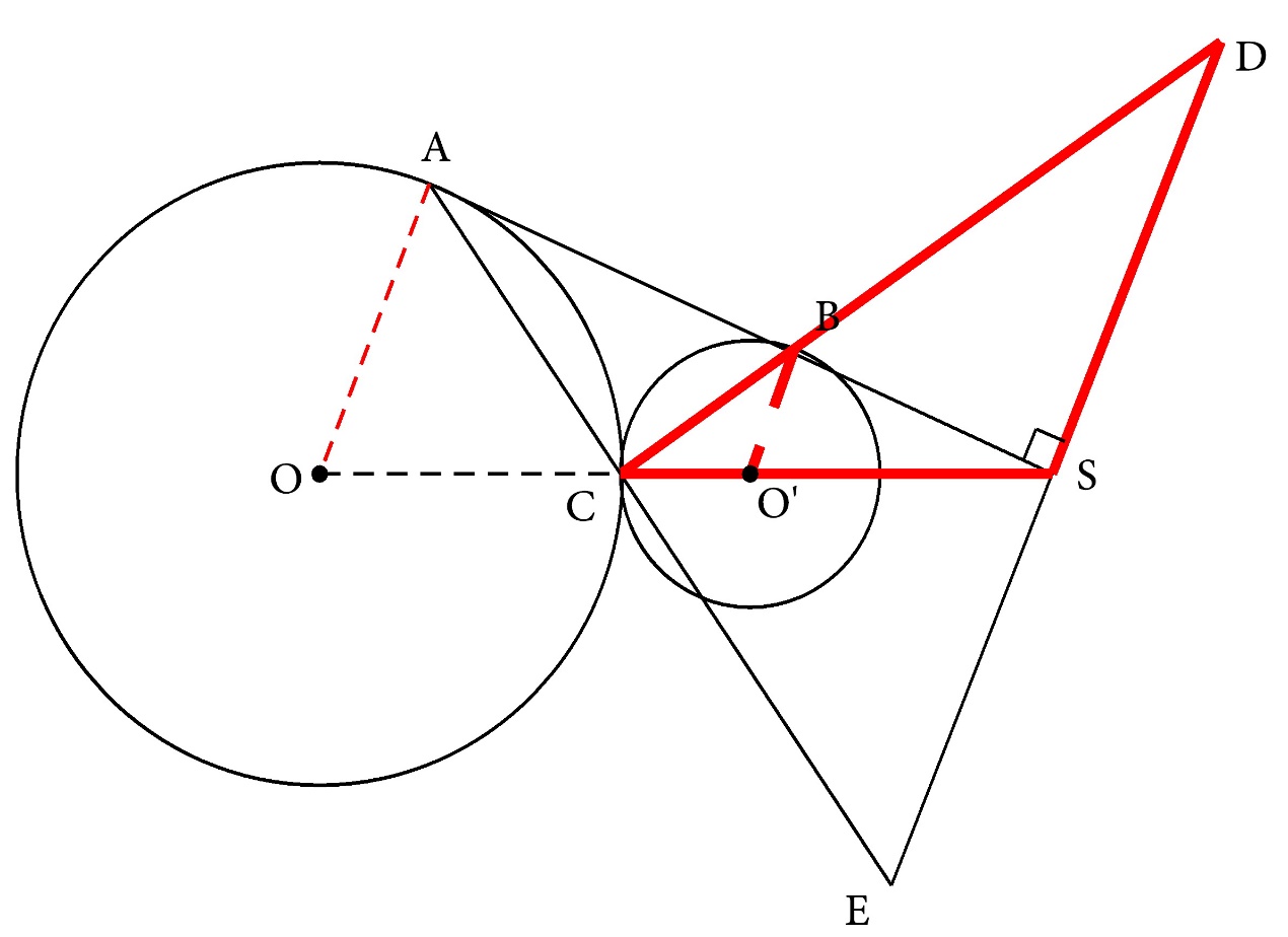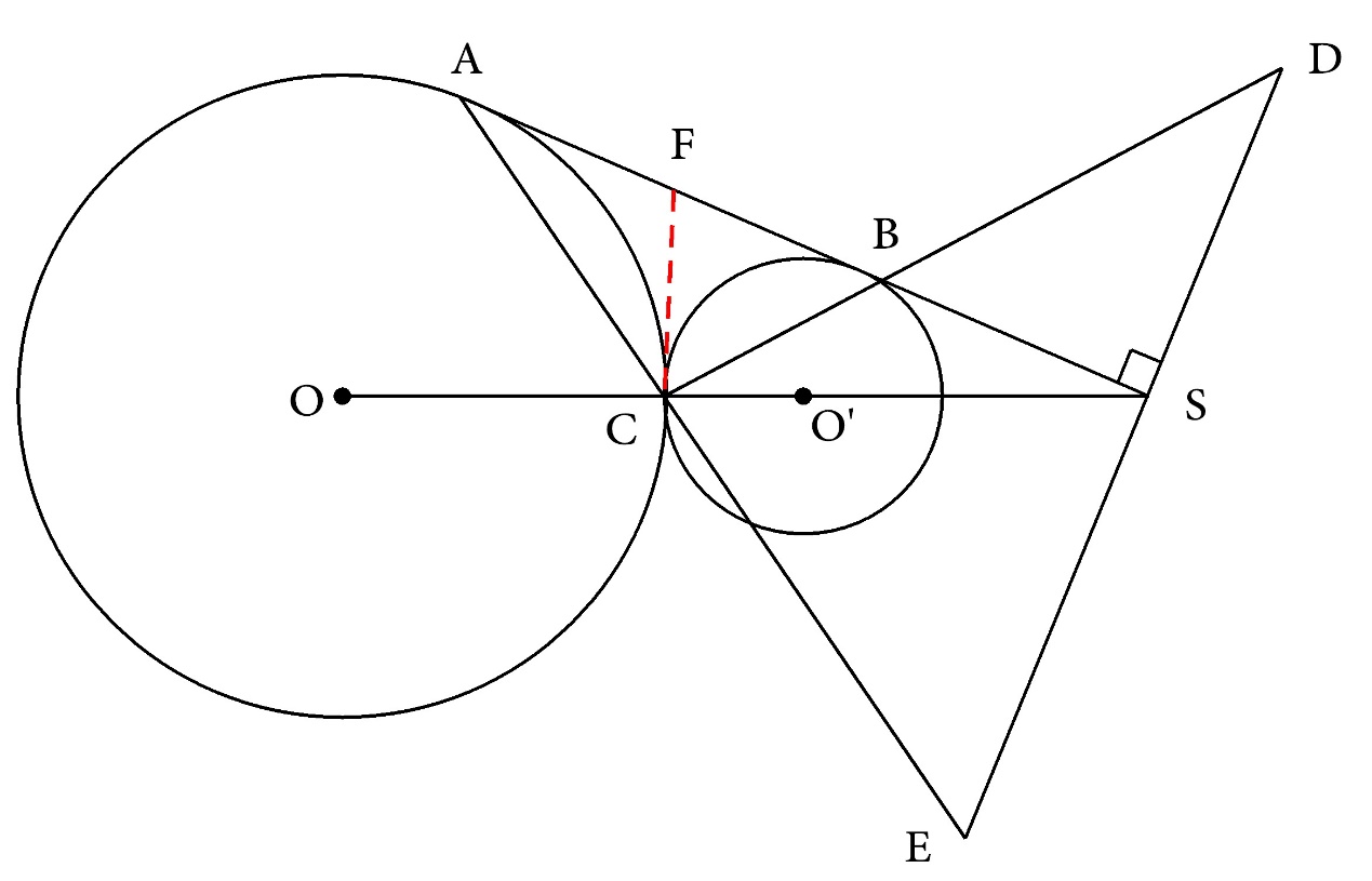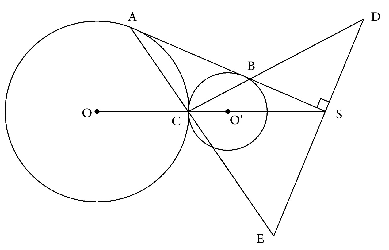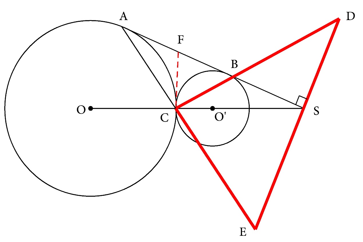 例3 如圖3-194,已知:⊙O和⊙O′外切于C,外公切線AB與⊙O、⊙O'分別相切于A、B,AB的延長線與OO′的延長線相交于S,過S作DE⊥AB交CB和AC的延長線于D、E。求證:SD=SE。