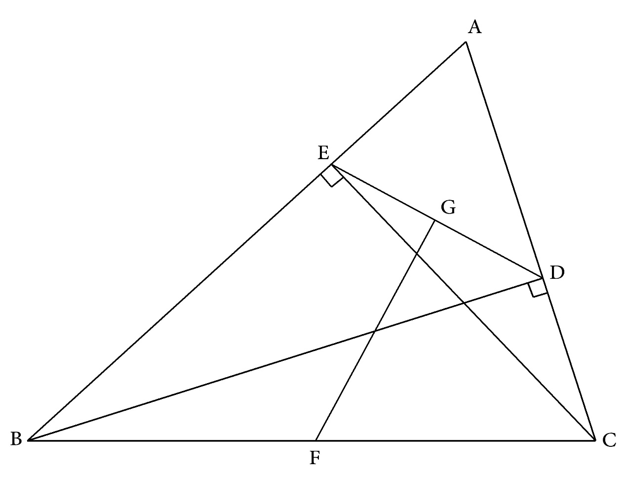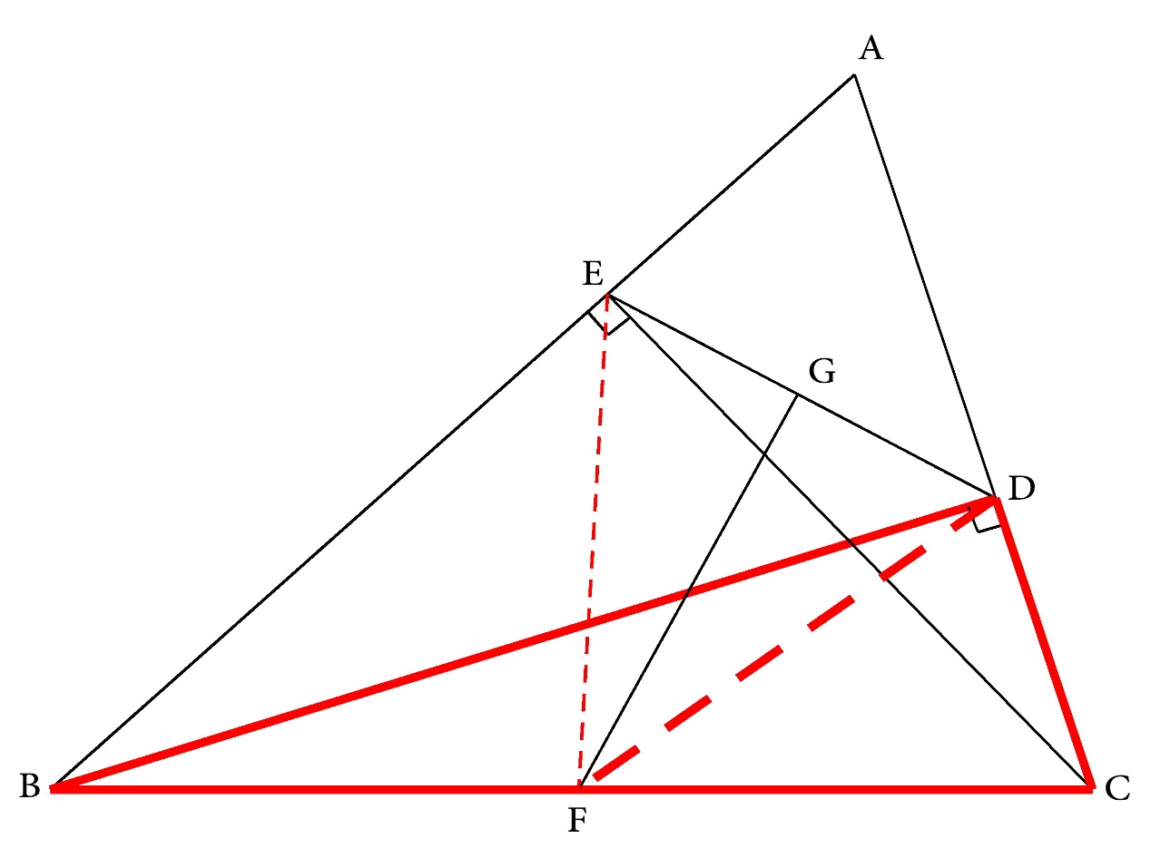 本題的分析也可以直接從∠BDC=∠BEC=90°開始,這樣應用圓周角的基本圖形的性質可得B、C、D、E四點共圓,且BC就是這個圓的直徑,BC的中點F就是這個圓的圓心。由于E、D都在這個圓上,所以DE就是這個圓的一條弦,而已知G是DE的中點,出現了圓中弦的中點,所以可直接應用垂徑定理證明FG⊥ED。