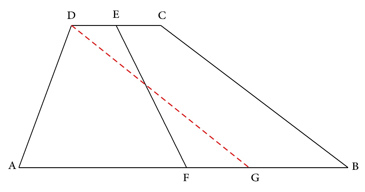 若考慮過頂點D作腰的平行線,則過D作DG∥CB交AB于G(如圖3-190)。于是由DC∥AB,就可得四邊形DGBC是平行四邊形,DC=GB,所以AG就等于AB-GB=AB-CD,這樣問題就成為要證EF=1/2AG。同時,由DG∥CB,又可得∠B=∠DGA,那么條件中的∠A+∠B=90°,就成為∠A+∠DGA=90°,也就推得∠ADG=90°。而現在要證明的EF=1/2AG是線段之間的倍半關系,且其中的倍線段AG現在是Rt△AGD的斜邊,從而就可以應用直角三角形斜邊上的中線的基本圖形的性質進行證明。由于現在圖形中是有直角三角形而沒有斜邊上的中線,所以應將斜邊上的中線添上,也就是取AG的中點H,聯結DH(如圖3-191),這樣即可得DH=1/2AG,問題也就成為要證EF=DH。由于H、F分別是AG、AB的中點,所以HF=AF-AH=1/2AB-1/2AG=1/2(AB-AG)=1/2GB=1/2CD=DE,且HF∥DE,就可得四邊形DHFE也是平行四邊形,EF=DH也就可以證明。