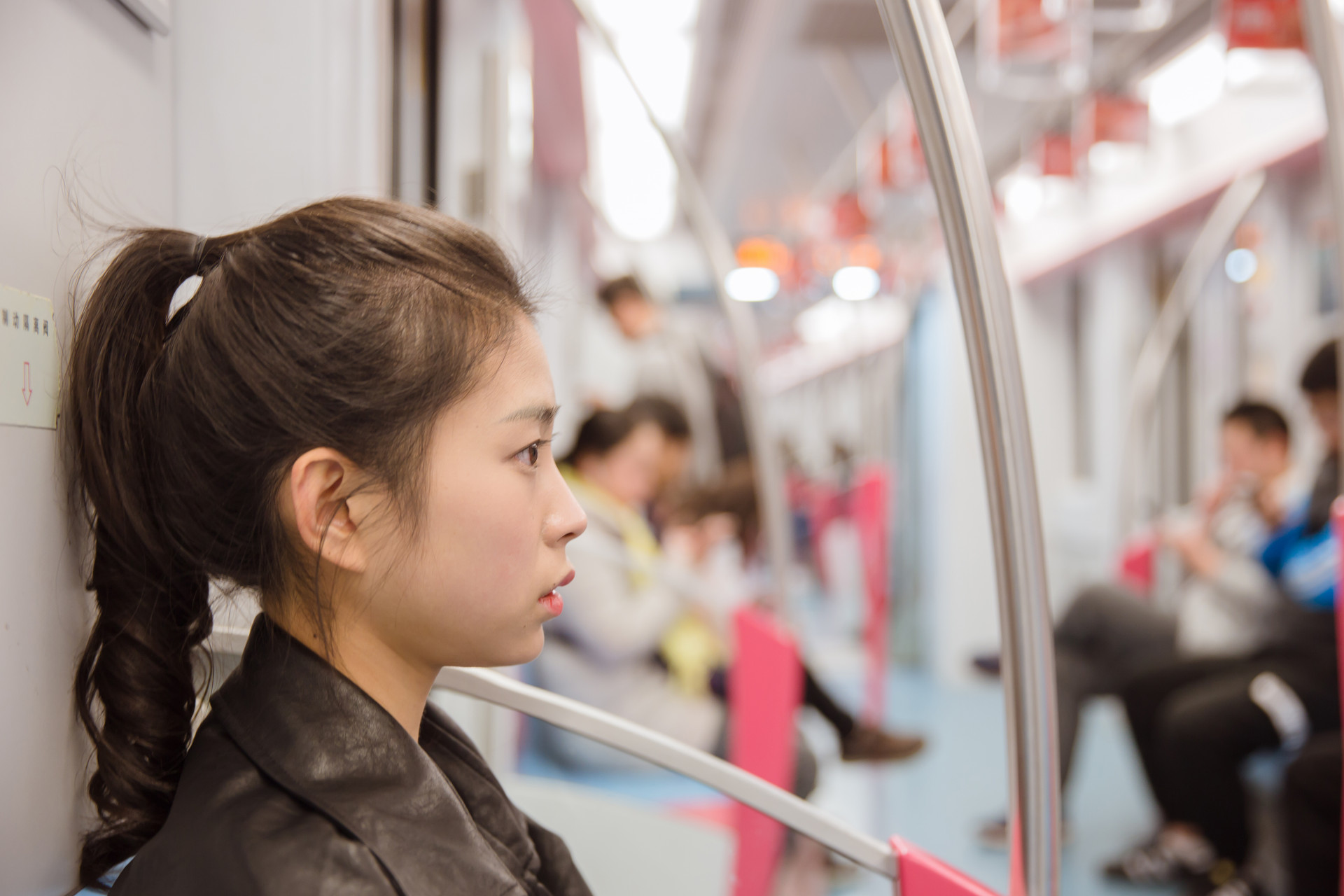 一個個子不到1米5的小女孩擠上了地鐵,旁邊一對夫妻領著一個5歲的小孩子坐在地鐵上,這時候爸爸看到這個小女孩擠上地鐵被擠得東倒西歪的,手拉上面的拉環很費勁。