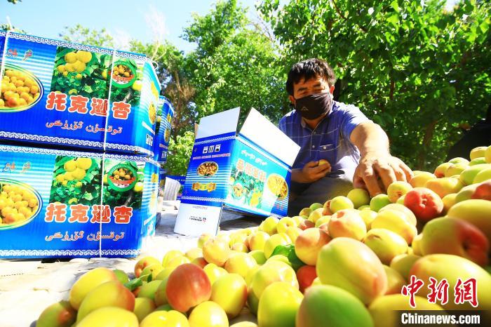 中新網烏魯木齊5月8日電(李靖海 胡國凱) “壓架藤花重,團枝杏子稠。”5月8日,“中國早熟杏之鄉”新疆托克遜縣夏鎮鐵提爾村的杏子已經成熟,杏農們正在忙著采摘、分揀、包裝剛剛成熟的杏子。