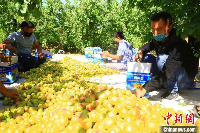 酸甜可口的杏子讓人垂涎欲滴,收購商在分揀包裝。 李靖海 攝