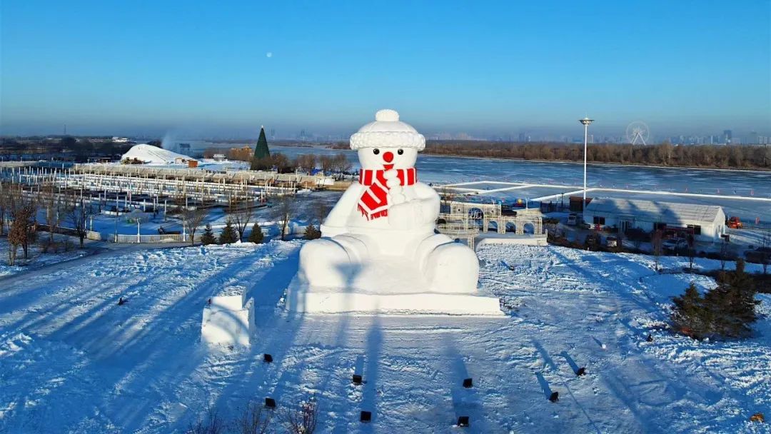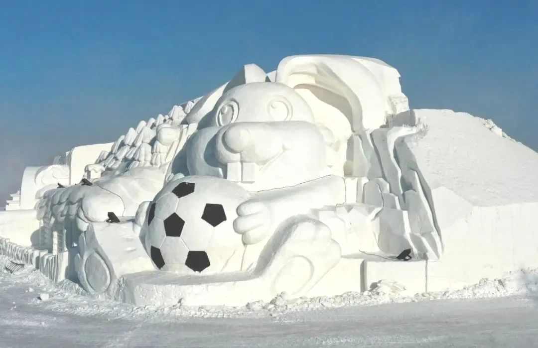 近日,位于群力松花江江畔誕生了一個高18米的微笑雪人,戴著絨帽和紅色圍巾,手里拿著冰糖葫蘆,巨大的身形、憨態可掬、笑容滿面,可愛極了!據了解,這座大雪人設計總長13米、寬10米、高18米,用雪量2000立方米。群力松花江江畔不僅有大雪人,還有拿著足球的大白兔雪雕,十余米高的“大白兔”聳著長長的耳朵,懷里抱著一個足球,十分可愛!