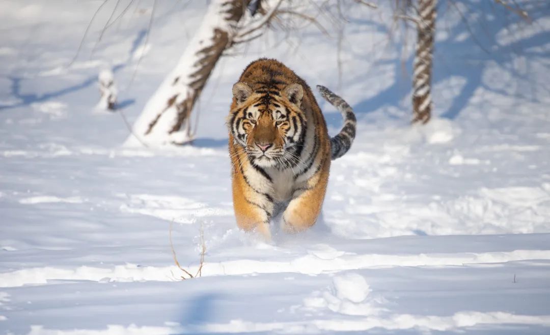 看東北虎在雪中奔跑