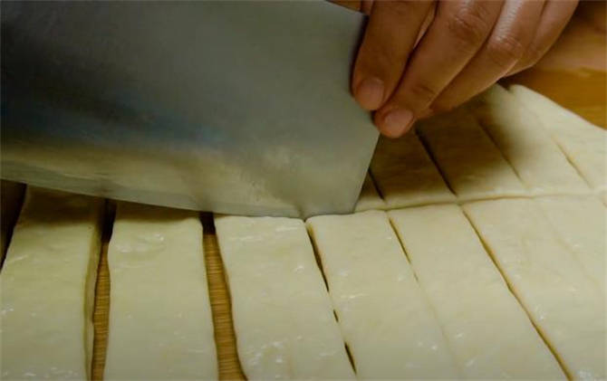 3.用刀切成長條,橫著再切一刀。