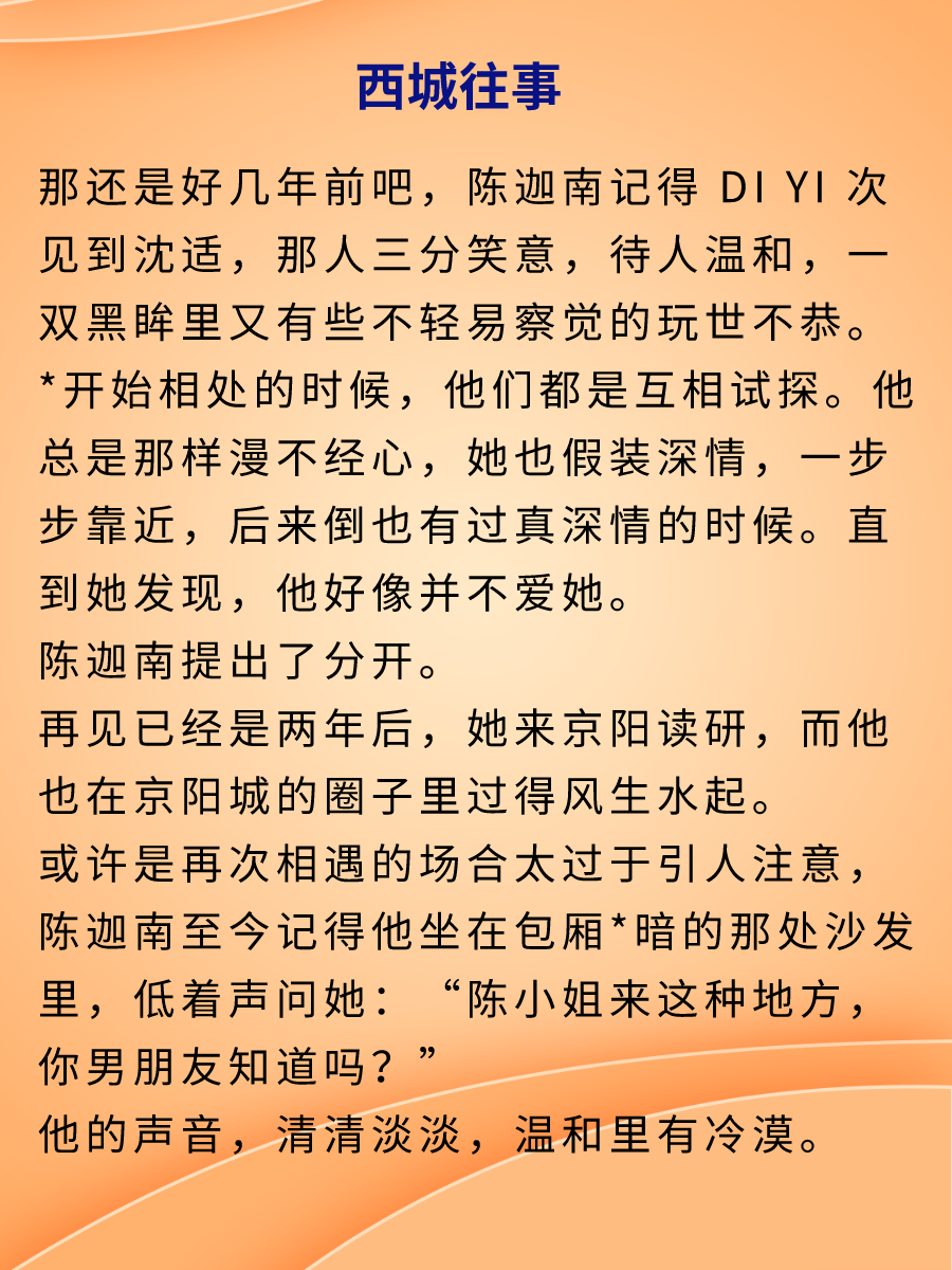 女主陳迦南和男主沈適兩個人擁有驚鴻一瞥的相遇,在你來我往間試探,陳迦南認為,沈適會給她財富,甚至是愛情,但唯獨不會給她婚姻。
