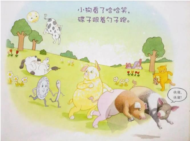 小狗看到三只小豬哈哈笑,碟子跟著勺子跑。
