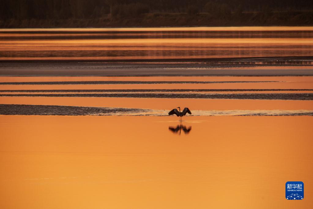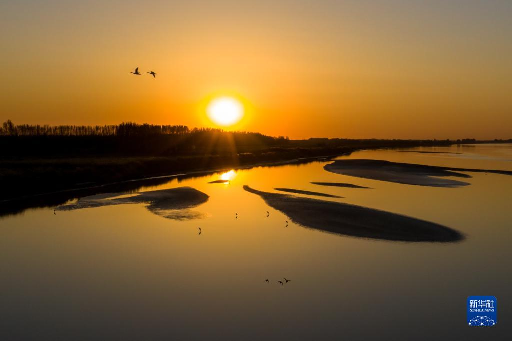 10月10日傍晚,水鳥在黃河下游山東高青段展翅欲飛。新華社發