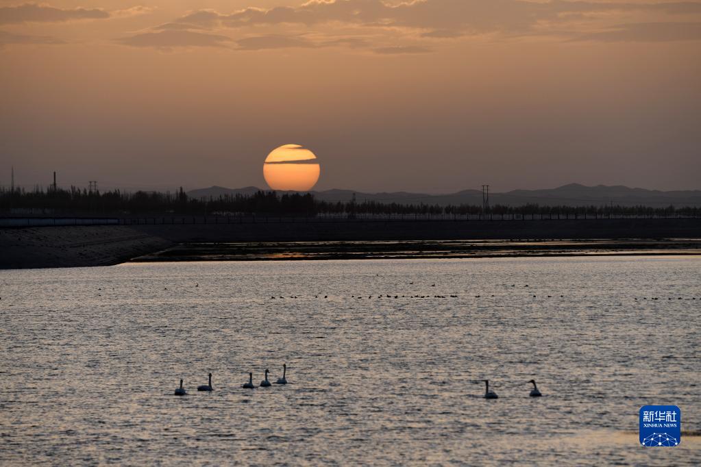 10月5日日落時分,在甘肅省阿克塞哈薩克族自治縣的冬不拉水庫,天鵝和野鴨在湖中戲水。新華社發