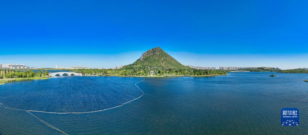 這是10月9日在山東省濟南市拍攝的晴空下的華山景區(無人機全景照片)。新華社發