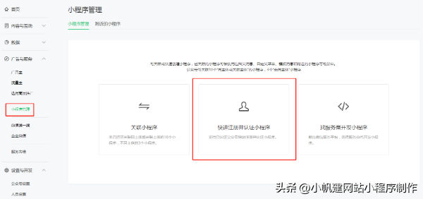微信開店的小店屬于是小程序,因此按照制作小程序的流程,首先是先注冊一個小程序賬號。企業商家一般已經有自己的公眾號,那么就先把公眾號做好認證,然后在公眾號后臺的“小程序管理”中,快速注冊并認證小程序,就能完成小程序賬號的注冊。