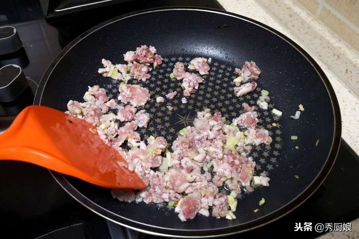 7.另起鍋加適量的油,下入蔥姜蒜爆香,炒香后下入肉末,將肉末炒散。