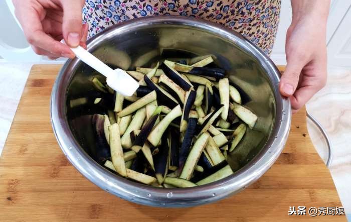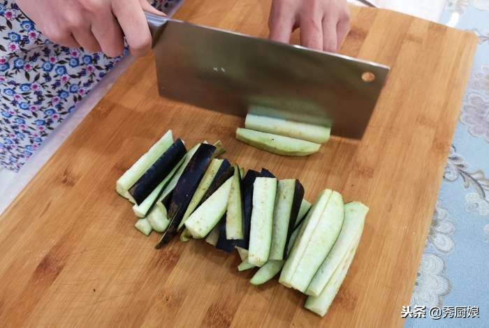 - 茄子清洗干凈,切成長條。