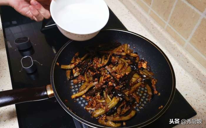 10.下入茄子條,翻炒均勻,再加入適量的水淀粉,再次翻炒均勻。