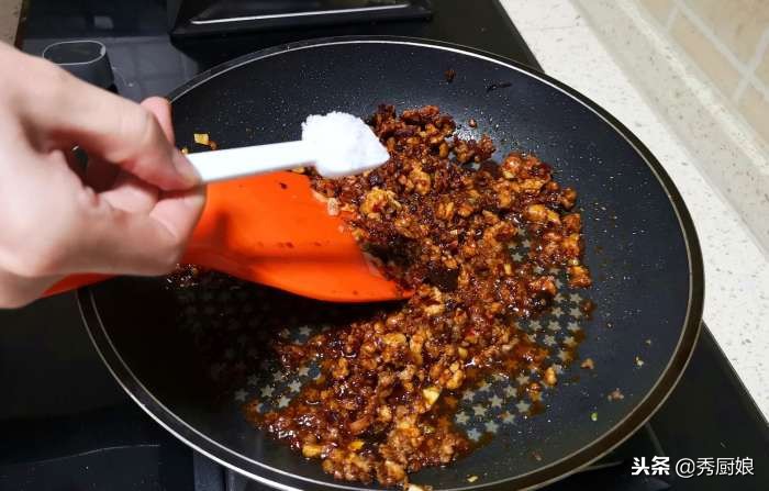 8.肉末炒至變色后,加入郫縣豆瓣醬,炒出紅油。