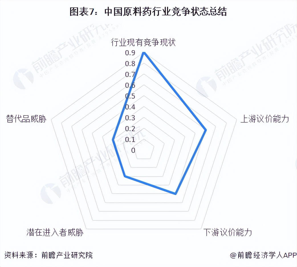 運用波特的“五力”模型,對原料藥行業的競爭環境分析中,可以看到原料藥制造行業競爭較為激烈。根據以上分析,前瞻對原料藥行業各方面的競爭情況進行量化,1代表最大,0代表最小,我國原料藥行業的競爭情況如下圖所示。我國原料藥制造行業“五力”中:現有企業間的競爭激烈;原料藥企業對產業鏈上游的議價能力較強;對產業鏈下游的議價能力總體一般;行業潛在進入者威脅較小;替代品的威脅程度較小。