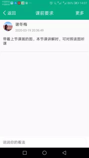 通過三周的線上課堂運行,熟練掌握了企業微信平臺的使用方法,保證了線上課程的順利實施。整體來說,上課過程平臺順暢,上課效果良好,學生課堂活動參與熱情也很高。上完課后學生還意猶未盡,紛紛給老師發來問候,說明學生對課堂學習效果是滿意的。課后進行的問卷調查學生也反映了“學習效果很好,課堂內容數量合適,難度合適,都能聽得懂”。相信通過嚴謹負責的備課上課和細心溫暖的交流溝通感染學生,點燃他們的學習熱情,師生一定能共同把線上課堂的每一節課上好學好。