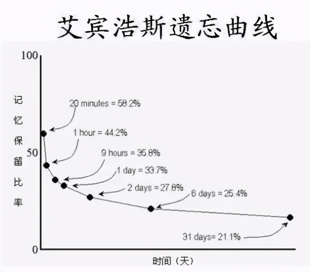 我們先說遺忘曲線,有一個曲線叫遺忘曲線,這是18世紀的時候德國心理學家艾賓浩斯發現的。