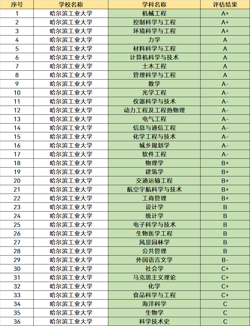 學科的優勢非常明顯,擁有9個國家重點學科一級學科、6個國家重點學科二級學科,在全國第四輪學科評估中,哈工大共有17個學科位列A類,學科名單如下圖: