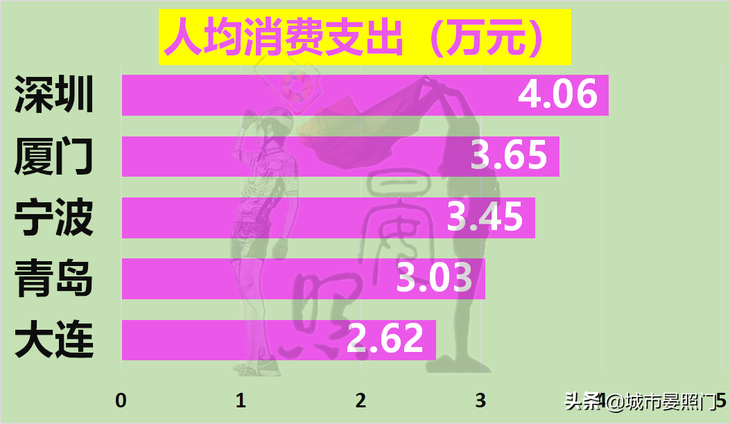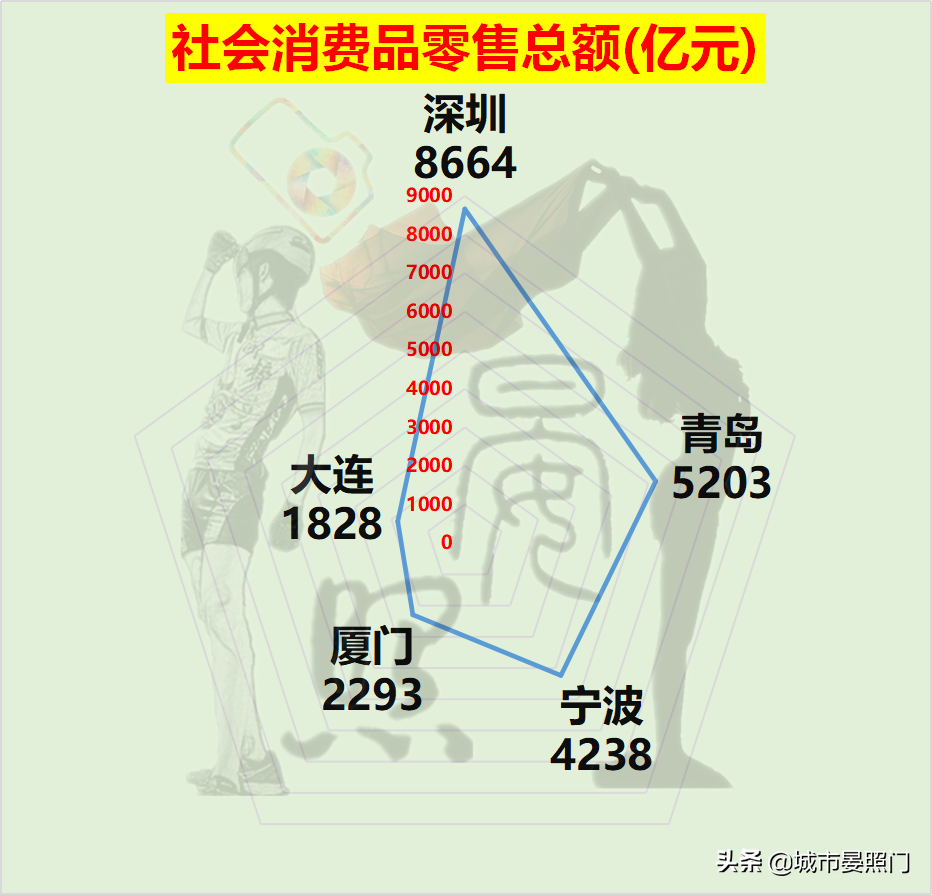 在城市整體消費力上五座城市之間可謂是大相徑庭,深圳領先青島66%,寧波落后青島23%,廈門落后寧波85%,大連則落后廈門25%,更是榜首深圳的五分之一。這也是五座計劃單列市已呈現指標中,相互之間的差距最大的一項指標,尤其是人口足足比廈門多230萬,約高出44%的大連,反而在整體消費力上落后廈門25%,如此巨大的反差實屬罕見。