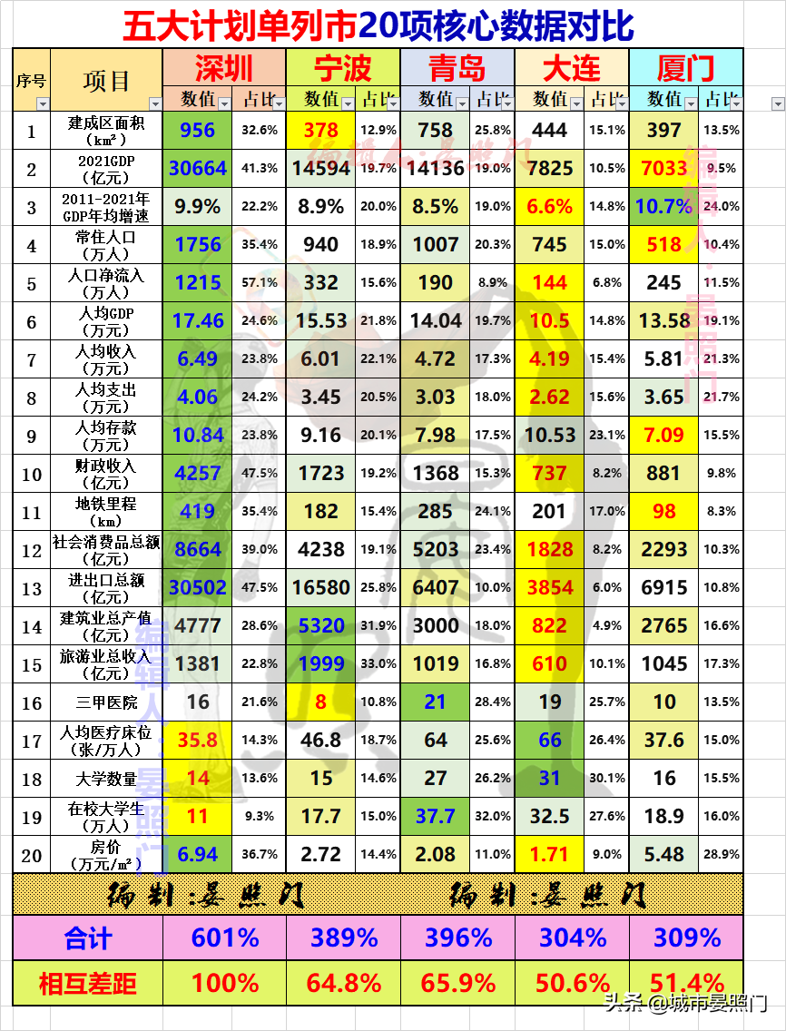 在看完五大計劃單列市20項核心指標的巔峰對決后,相信大家對本文開頭以及其它很多疑問早已迎刃而解。接下來,便讓我們通過更直觀的數據匯總將五座城市的綜合實力“一網打盡”: