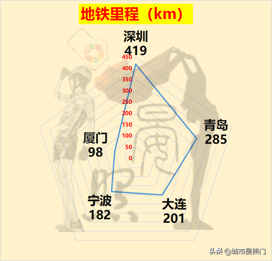 在城市第一大公共交通網絡建設上,深圳再次毫無懸念奪得榜首,青島則穩居第二,領先第三的大連42%,寧波則以10%的微弱劣勢不及大連,至于和深圳面積差不多的廈門,則成為五城中唯一不足100km的單列市,僅有深圳的23%。