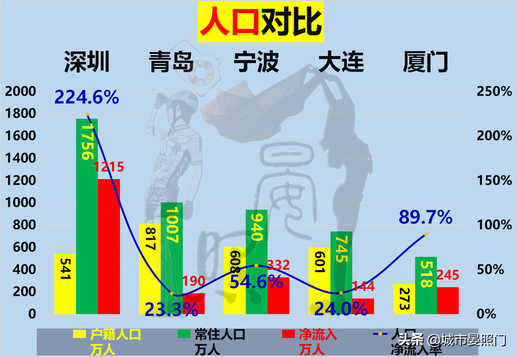 在常住人口方面,五座城市出現了戲劇性的一幕,即土地面積只有青島、寧波五分之一的深圳,反而在人口上足足領先約1.8倍,而面積最大的大連則足足比深圳少1000余萬,尤其是面積和深圳相差無幾的廈門,總人口才剛剛突破500萬,甚至比倒數第二的大連還少230萬。