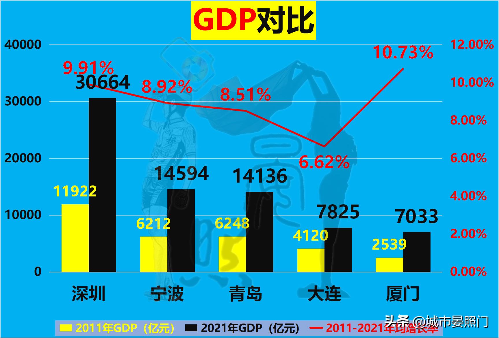 在看完五城過去十年的平均增速后,不難發現,最有可能實現反超的不是差距僅有3.2%的青島和寧波,因為領先的寧波增速反而更快。反而是差距為11.3%的廈門和大連,畢竟廈門的速度足足是大連的1.62倍。