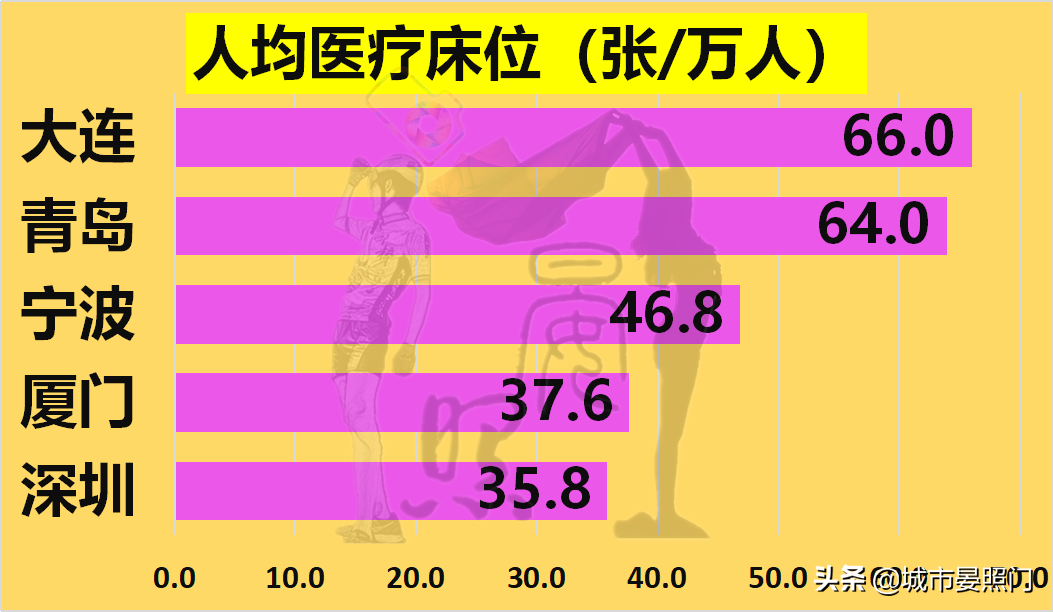 雖然在象征醫療服務質量的人均床位上,依舊是北方的兩大城市青島、大連穩居前二,但是榜首卻發生了變化,在醫療硬實力上和榜首失之交臂的大連,這次終于圓夢榜首,這也是大連首次奪得第一,是五城中最晚一個獲此殊榮的城市。與此同時,面積均不及2000km2的袖珍地級市深圳和廈門,則巧合的全部低于40張/萬人,這也是一線城市深圳首次出現墊底項。