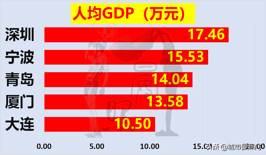 作為城市居民富裕程度和城市營商環境象征的人均收入上,寧波成為五城中唯一能和一線城市深圳相提并論的,僅僅落后深圳8%不到,其次便是面積最小的廈門,落后深圳11.7%。反觀青島和大連,全部低于5萬,不及深圳70%。