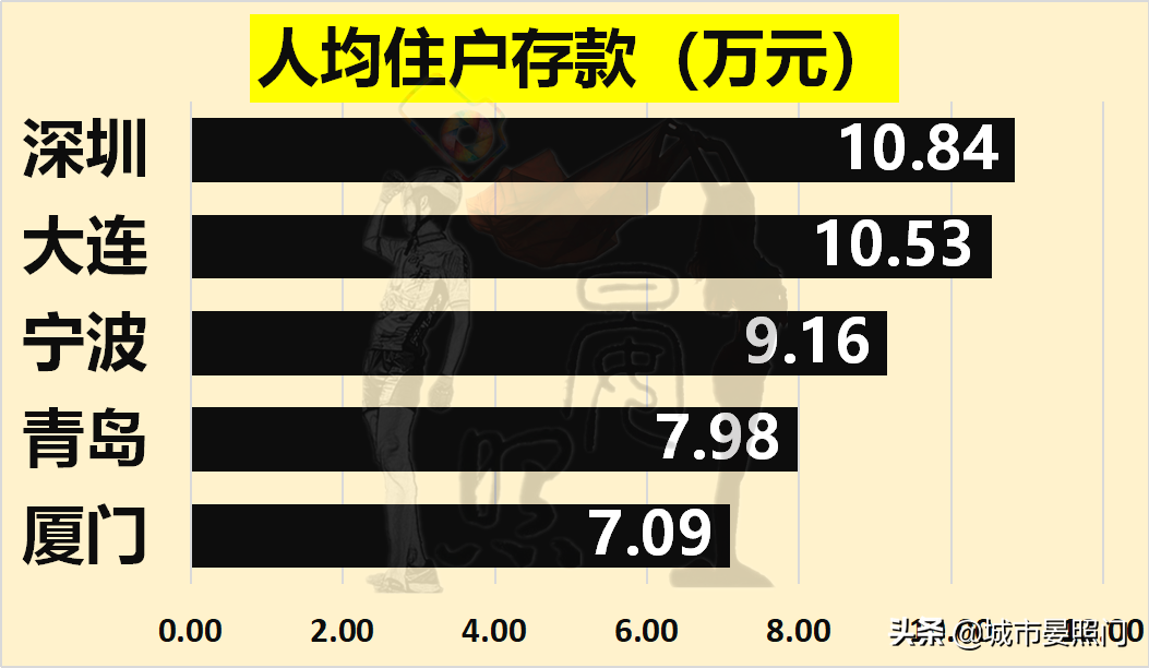 在象征居民富余程度的存款上,大連成了最大的黑馬,一舉反超廈門、青島、寧波,躍升到第二,而且僅僅落后深圳2.9%,幾乎是和一線城市平分秋色。反觀青島和廈門則全部低于8萬,其中墊底的廈門和榜首的深圳足足相差53%。