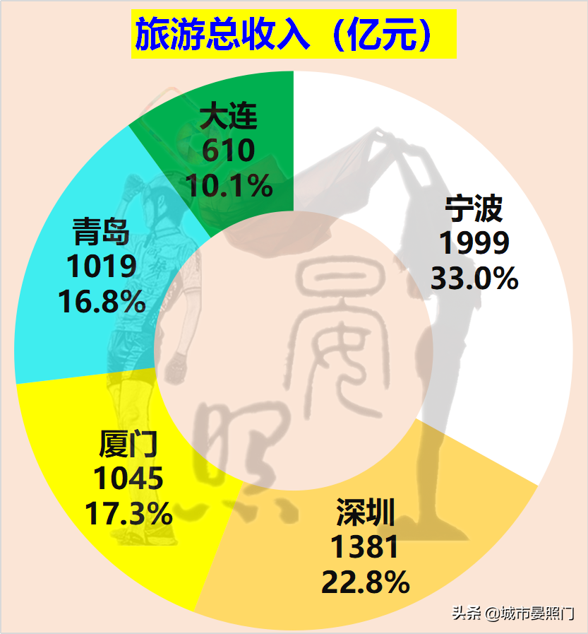 擁有溪口·滕頭和天一閣·月湖2大5A景區的寧波,在文旅收入上完勝同樣擁有2個5A景區的深圳,而且深圳的歡樂谷·世界之窗和觀瀾湖名氣似乎更大。同樣擁有金石灘+老虎灘兩大5A景區的大連,則僅有寧波的三分之一不到,以及深圳的一半不到,以至于均只有1個5A景區的青島(嶗山)和廈門(鼓浪嶼)也要遠高于大連,這也直接導致大連在文旅上略顯相形見絀。