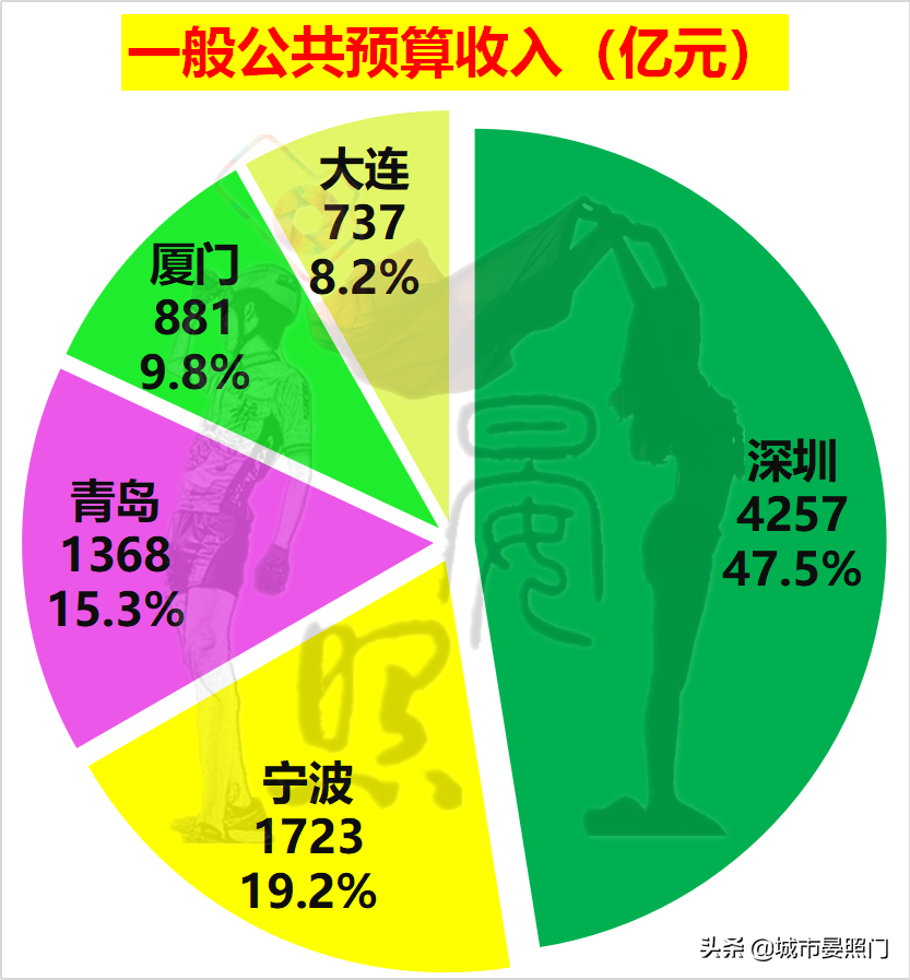 在GDP總量上,五座城市可謂是涇渭分明,其中深圳以3萬億遙遙領先,雄踞全國第三,而寧波則險勝青島,兩城同為1.4萬億,無獨有偶,大連和廈門同樣相互緊咬,均處于7000-8000億之間。如果光看GDP,似乎最有可能實現反超的便是青島反超寧波,其次便是廈門反超大連。
