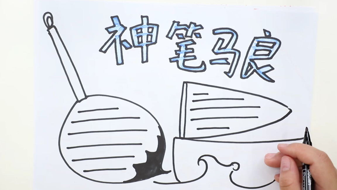 1、第二種神筆馬良手抄報,我們可以先寫出我們的主題神筆馬良,然后我們來畫上文本框,可以畫出毛筆的文本框,另一邊我們可以畫上一個小帆船,作為我們的文本框,然后我們來涂上顏色;