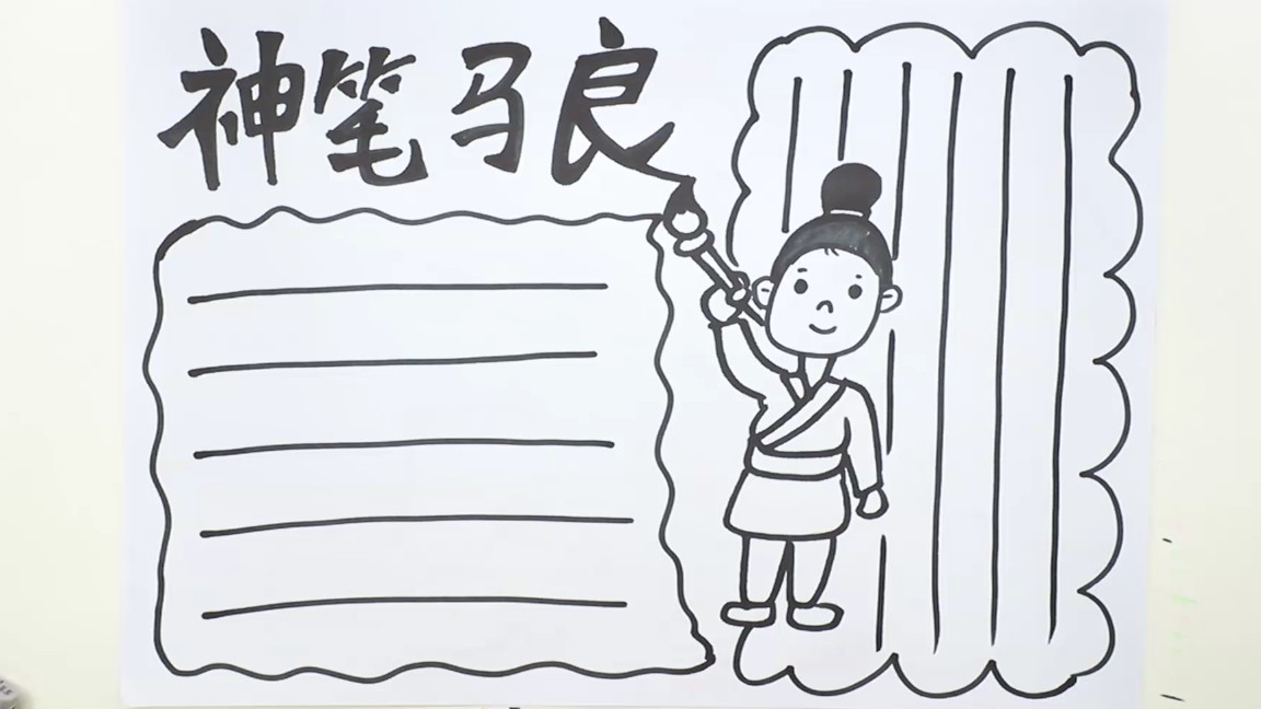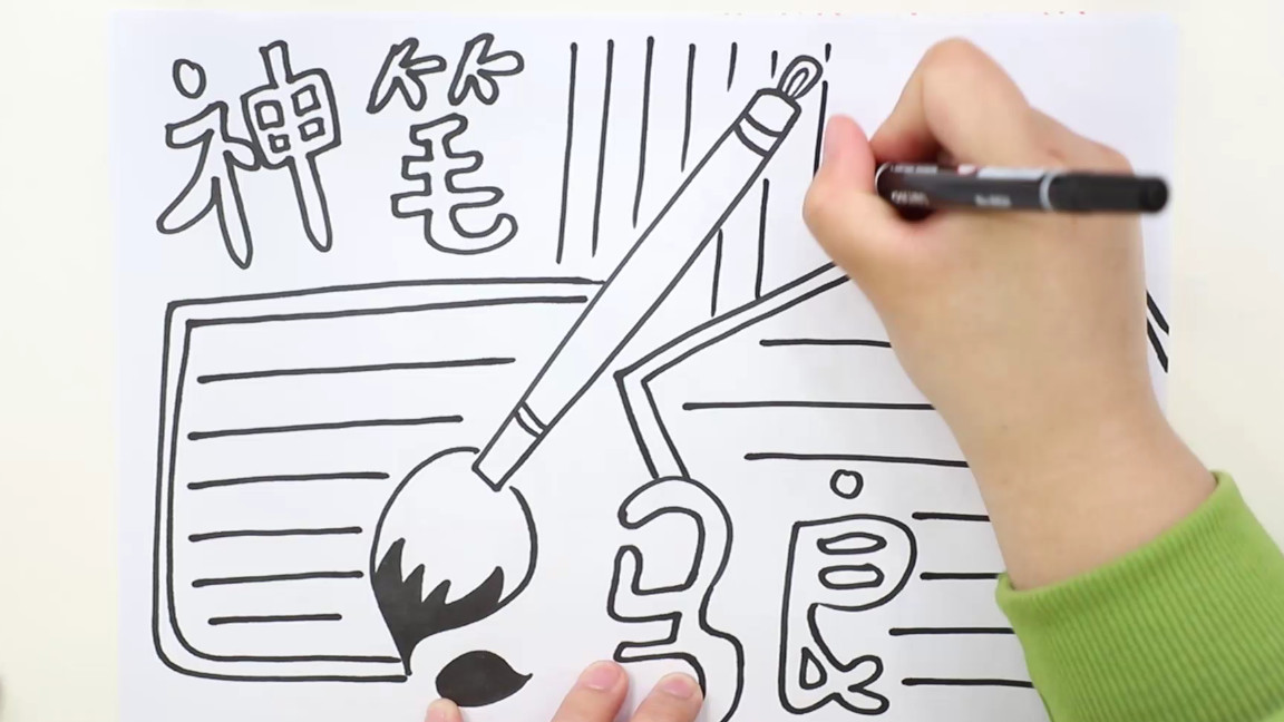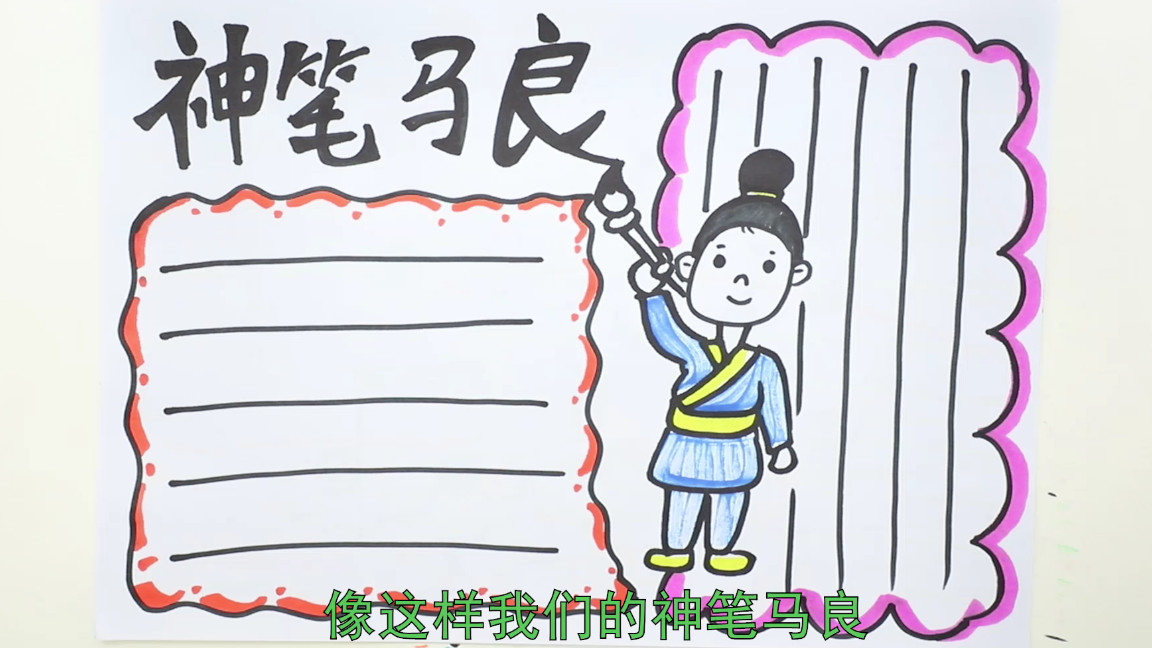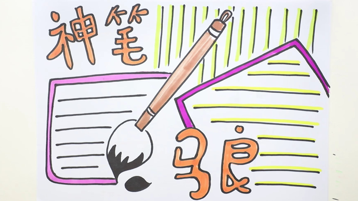 1、第一種我們可以先在中間,畫出一只大大的毛筆,然后我們來寫上我們的主題,神筆馬良,然后我們來畫上文本框,畫上文本線條,然后我們來涂上顏色;