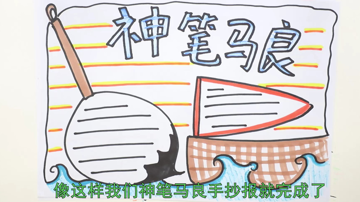 2、棕色涂上毛筆桿的顏色,藍色涂上水波紋的顏色,然后用棕色和橘紅色,畫上我們小船的顏色,然后我們選擇黃色,畫上背景的文本線條,同樣用橘黃色描邊,像這樣我們神筆馬良手抄報就完成了。