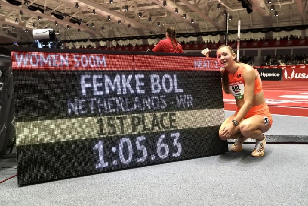 事實表明600米這個比400米長200米,比800米少200米的項目,顯然更適合有氧能力更強的800米專項的高水平運動員。那500米呢?恰巧不久前的2月4日,女子室內500米“世界紀錄”也被更新了。來自荷蘭的400米欄選手波爾(Femke BOL)以1:05.63創造了新的最好成績。