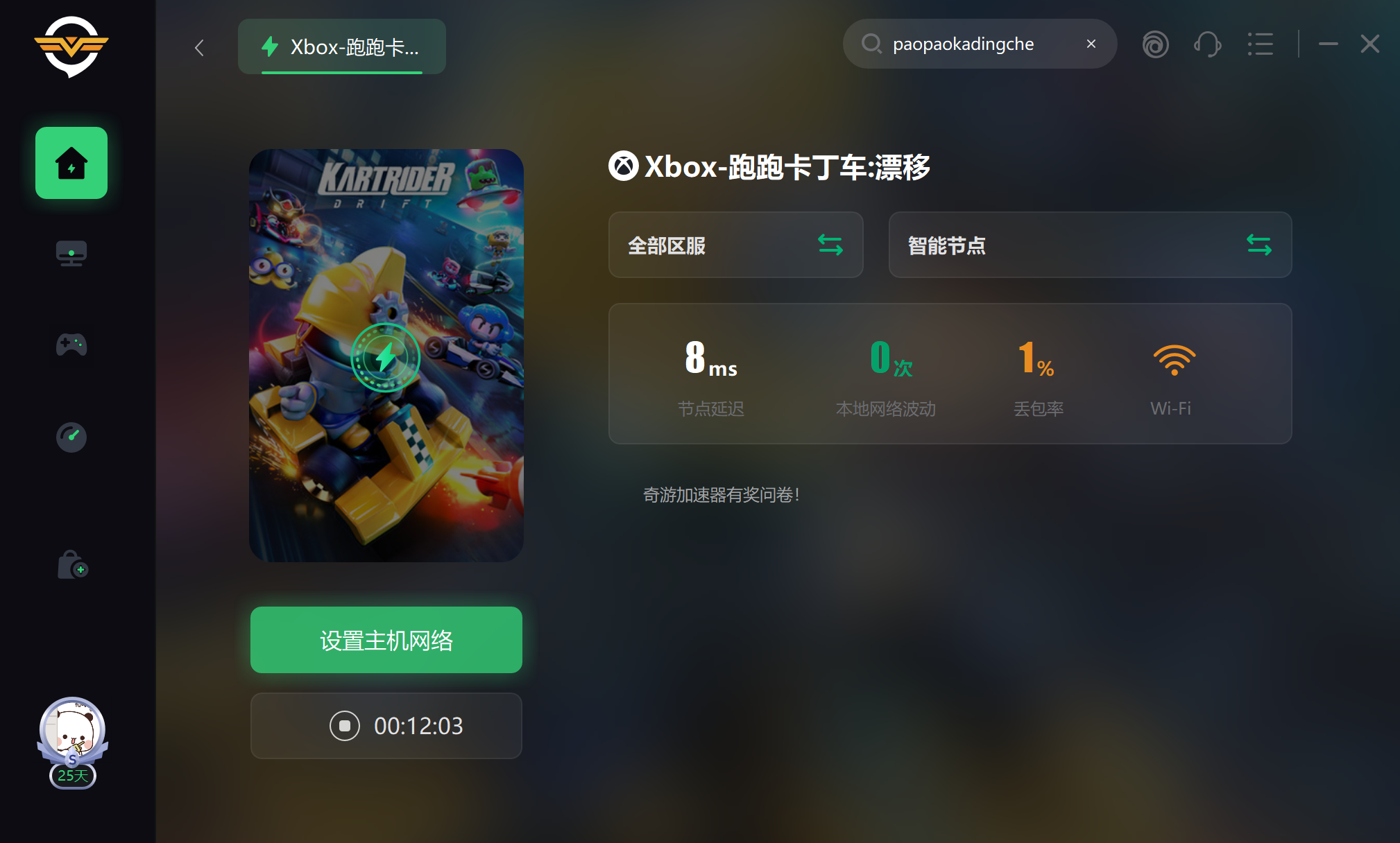 目前玩家們在主機平臺中直連上網時進入跑跑卡丁車漂移,就會收到鎖區提示,甚至還有封號的風險,建議大家開啟加速工具,小編親測在電腦端可以通過奇游來加速跑跑卡丁車漂移: