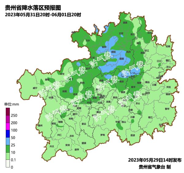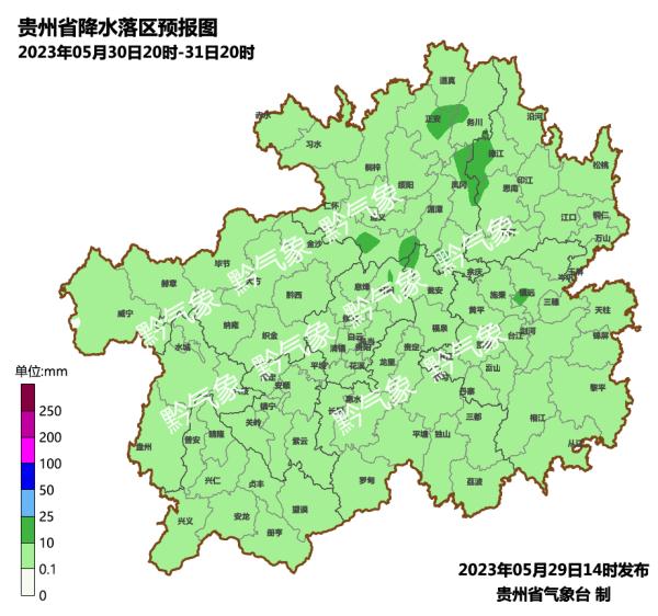 據貴州省氣象臺信息,5月29日08時至5月30日08時,全省多云到晴有分散陣雨或雷雨,大雨出現在道真縣 1縣域內的2個觀測站(鄉鎮最大為道真縣中國儺城46.2毫米),中雨有3個觀測站,小雨有82個觀測站。