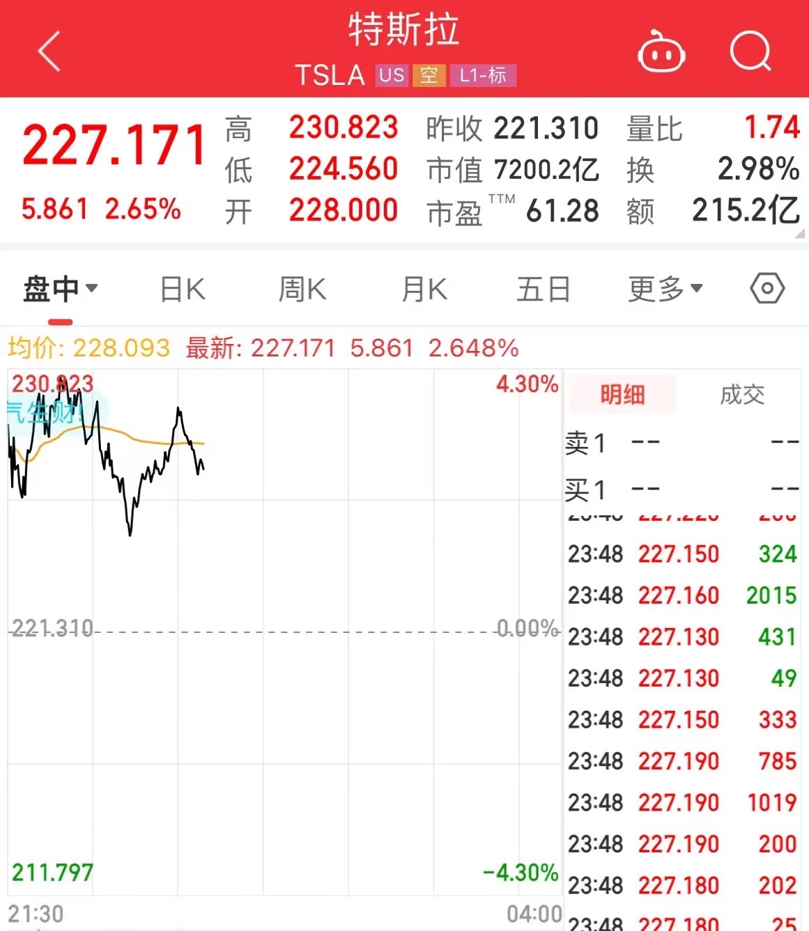 北京時間6月7日晚美股開盤,特斯拉(TSLA)股價震蕩走高,一度漲超4%,股價創2022年10月以來新高。截至發稿前漲2.65%,市值大增185.76億美元(約1324.35億元人民幣)。特斯拉整個五月市值增長了1255.7億美元,漲幅為24.11%。