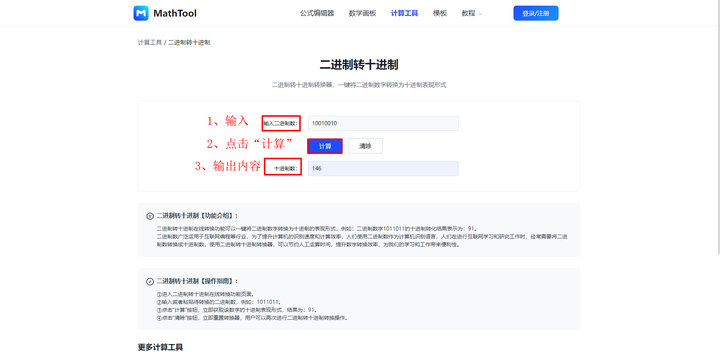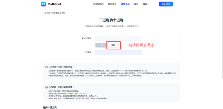 如果想再計算其他的進制,只需要點擊“計算”旁邊的【清除】即可,一鍵將輸入和輸出的所有內容全部清除,即刻進入下一個的進制轉換問題?