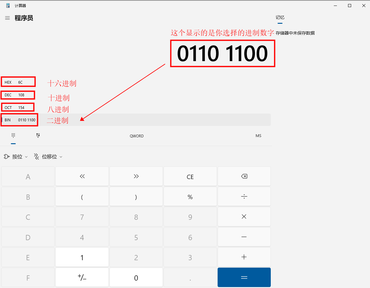 左側用紅線標注的字母從上到下依次代表十六進制、十進制、八進制和二進制
