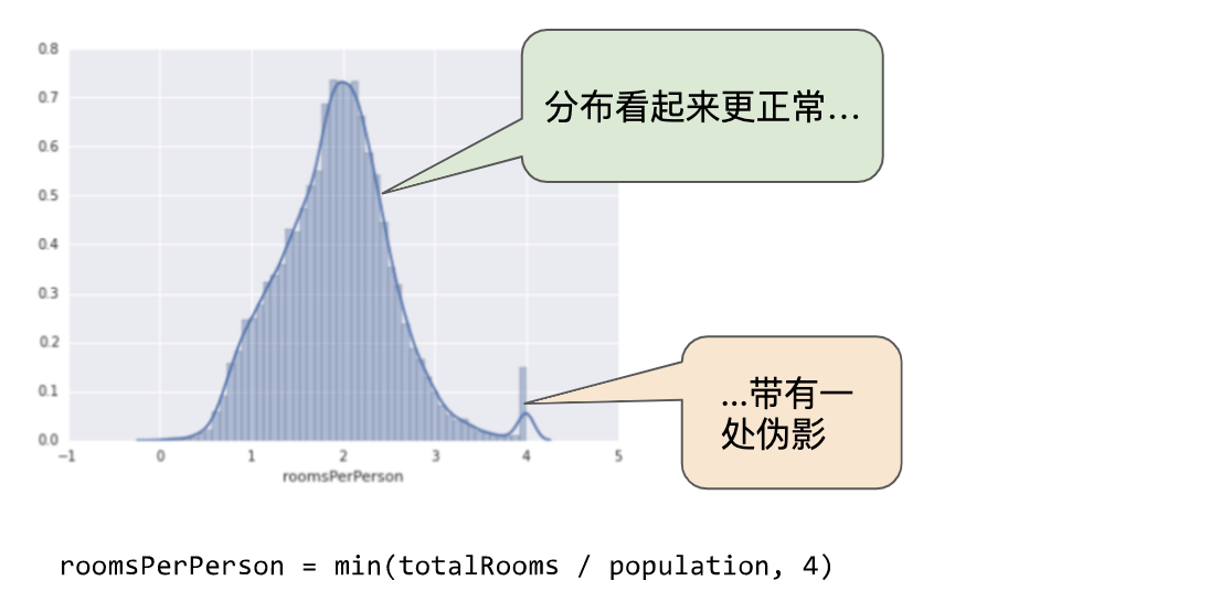 對數縮放可稍稍緩解這種影響,但仍然存在離群值這個大尾巴。我們來采用另一種方法。如果我們只是簡單地將 roomsPerPerson 的最大值“限制”為某個任意值(比如 4.0),會發生什么情況呢?