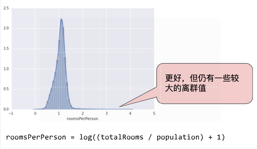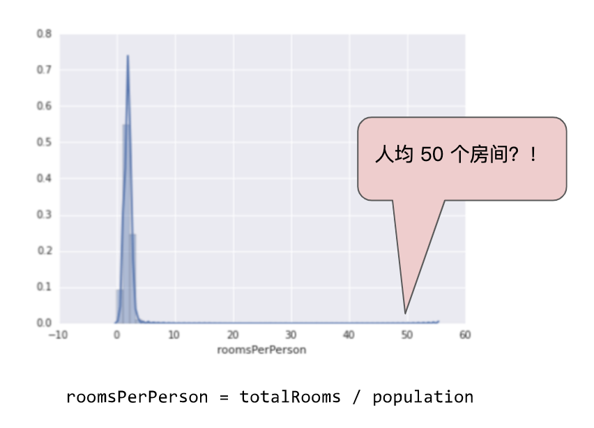 下面的曲線圖表示的是加利福尼亞州住房數據集中稱為 roomsPerPerson 的特征。roomsPerPerson 值的計算方法是相應地區的房間總數除以相應地區的人口總數。該曲線圖顯示,在加利福尼亞州的絕大部分地區,人均房間數為 1 到 2 間。不過,請看一下 x 軸。
