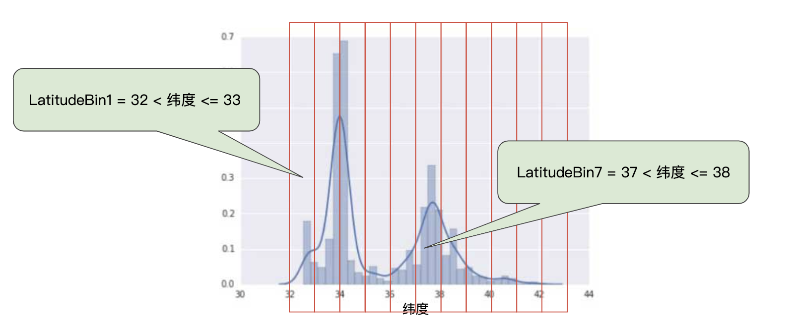 為了將緯度變為一項實用的預測指標,我們對緯度“分箱”,如下圖所示: